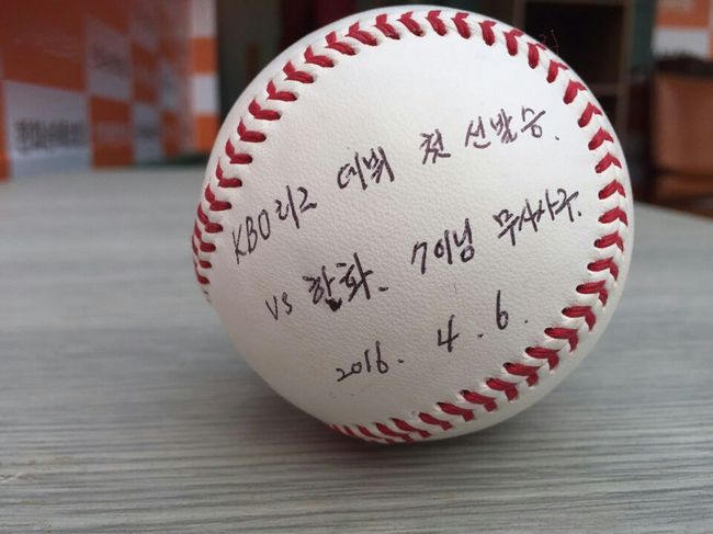[사진] 위-역투하는 신재영. 아래-신재영의 승리 기념구(넥센 히어로즈 제공).