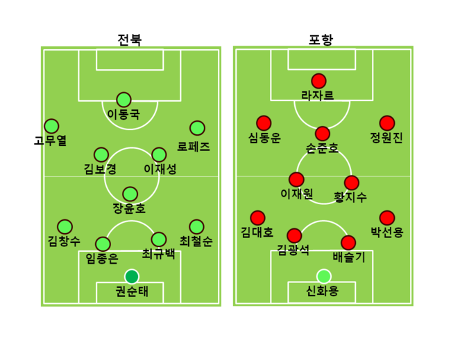 전반 이른 시간 포항에 악재가 찾아왔다. 핵심 미드필더인 손준호가 전북 진영에서 착지를 잘못해 들것에 실려나갔다. 포항은 손준호 대신 측면 자원인 강상우를 투입했다. 2선을 두루 볼 수 있는 심동운이 손준호의 자리를 대신했다.