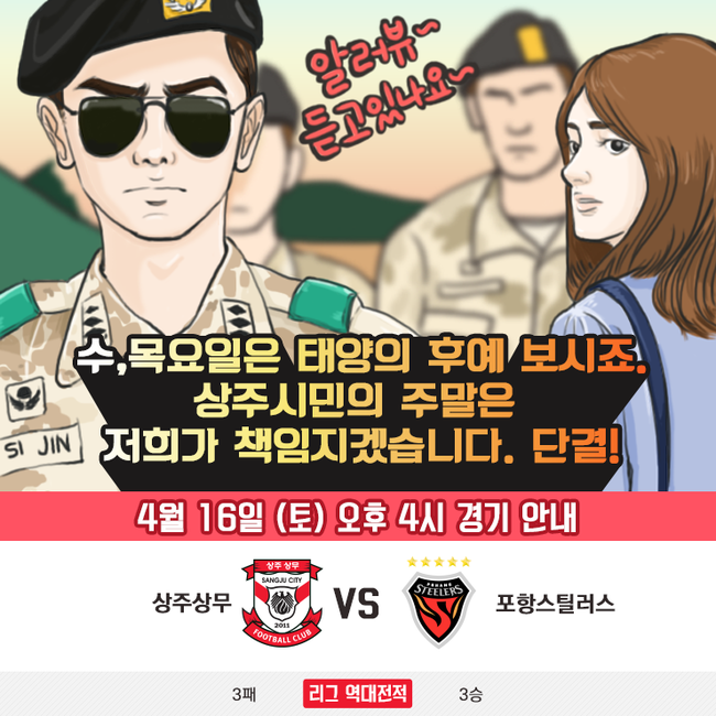 16일 오후 4시 상주시민운동장에서 펼쳐지는 현대오일뱅크 K리그 클래식 6R 포항과의 홈경기에서 상주상무의 잇 아이템으로 손꼽히는 대동공업 UTV를 황금마차로 변신시킨다. ‘상상 황금마차’의 이름을 얻은 UTV는 경기 전 EPL존(6문) 앞에서 판매를 시작하며, 경기 중에는 상주상무 최전방G.P.초소(가변석) 옆에서 판매를 실시한다.