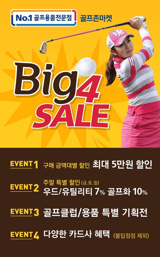 빅4 세일 이벤트는 오는 24일까지 진행되며, 특히 15~17일 주말에는 우드 및 유틸리티 골프클럽에 대해 7%, 최대 3만원 할인이 적용된다. 22~24일 주말에는 골프화를 10%, 최대 3만원 할인된다.