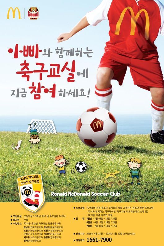 FC서울이 맥도날드와 함께 ‘로날드 맥도날드 어린이 축구교실’의 일환인 ‘아빠와 함께하는 축구교실’ 상반기 참가 가족을 모집한다.