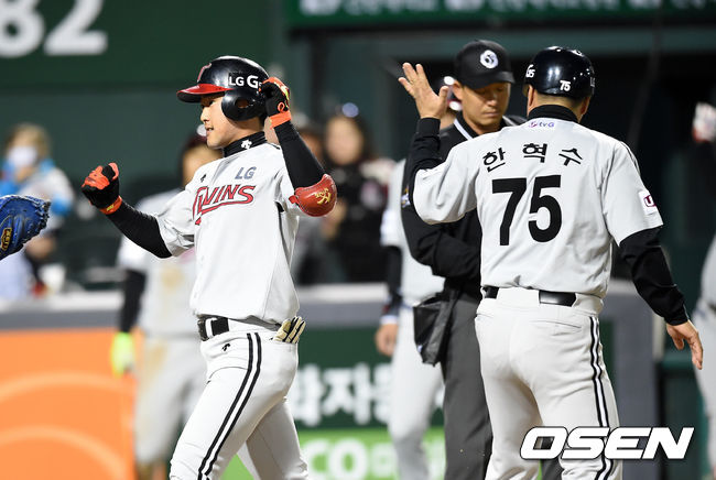 경기 후 정주현은 “(이)준형이의 첫 승에 도움이 돼서 기쁘다. 변화구를 노리고 외야플라이를 치려고 했는데 운이 좋았다”고 웃었다. / drjose7@osen.co.kr