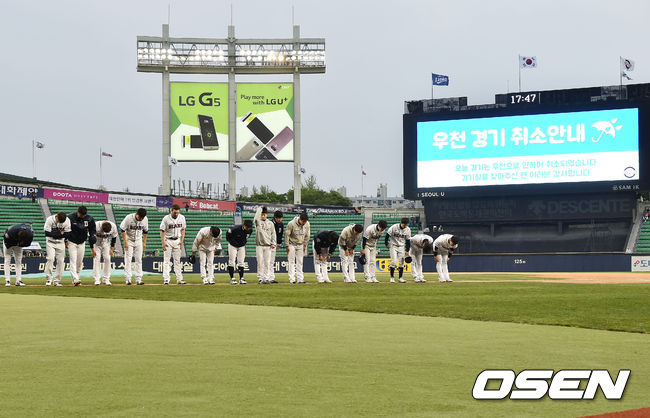 그러나 오후 5시 27분 다시 빗줄기가 굵어지자 마운드와 홈플레이트에 방수포를 다시 깔았다. 선수들도 덕아웃으로 철수해 비가 그치기를 기다렸다. 하지만 비가 계속 내리고 밤이 될수록 비구름이 몰려온다는 예보로 인해 취소를 결정했다. /orange@osen.co.kr