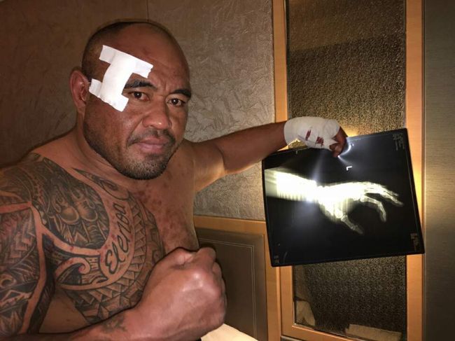 16일 중국 베이징공인체육관에서 열린 샤오미 로드FC 030 무제한급 4강전서 명현만에 KO 승을 거둔 마이티 모(미국)의 왼쪽 엄지 손가락이 골절됐다.