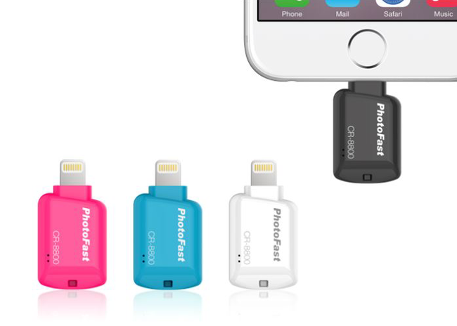 '포토패스트(PhotoFast) CR-8800’는 애플 업데이트 이후 출시된 세계에서 가장 작은 제품(가로 1.8cm, 세로 3.3cm, 폭 0.9cm)이다. 마이크로 SD카드(최대 128GB)로부터 애플 기기에 데이터를 손쉽게 저장, 전송, 스트리밍, 백업할 수 있도록 했다.