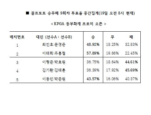 체육진흥투표권 스포츠토토의 수탁사업자인 케이토토는(www.ktoto.co.kr)는 오는 21일(목)에 경기도 포천 대유 몽베르 CC에서 열리는 ‘KPGA 동부화재 프로미 오픈’ 1라운드를 대상으로 한 골프토토 승무패 9회차 1번 매치에서 A선수인 최진호(48.92%)가 B선수인 문경준(32.83%)보다 좋은 성적을 기록할 것으로 예상했다고 밝혔다.