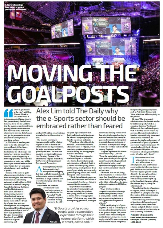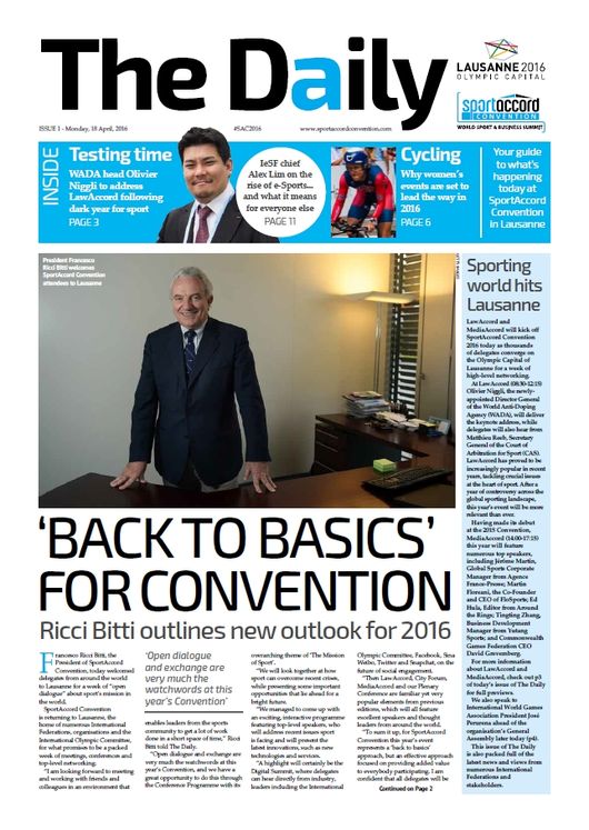 오는 21일 스포츠어코드 컨벤션에서 ‘프로 대 아마추어, 바보들을 위한 게임(Pros vs Amateurs –Gaming for Dummies)’이라는 주제로 열리는 토론에 패널로 참석하여, e스포츠의 가치와 스포츠로서 가능성을 역설할 임철웅 IeSF 사무총장이 19일 스포츠어코드 컨벤션 공식 소식지 '더 데일리(The daily)'의 표지를 장식했다.