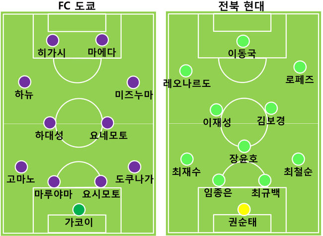 전북은 도쿄의 좌우 측면을 흔들었다. 전반 19분에는 임종은이 오른쪽 측면의 로페즈에게 긴 패스를 연결해 공간 침투를 만들어냈다. 로페즈는 문전까지 파고 들어 슈팅하려 했지만, 도쿄의 수비수에 걸려 아쉽게 시도하지 못했다.