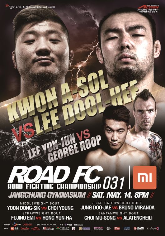 한편 ROAD FC (로드FC)는 5월 14일 서울 장충체육관에서 XIAOMI ROAD FC 031을 개최한다. 메인이벤트는 ‘라이트급 챔피언’ 권아솔과 ‘미들급’ 이둘희의 무제한급 대결이고, 코메인 이벤트는 ‘밴텀급 챔피언’ 이윤준과 ‘UFC 출신’ 조지 루프의 페더급 경기다.