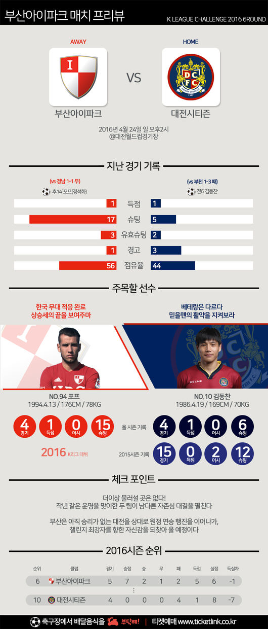 부산은 선두권과의 격차가 더 벌어지지 않기 위해서라도 다가오는 대전전에서 반드시 승리가 필요하다. 지난 18일 안방에서 열린 경남과의 챌린지 5라운드에서 최영준 감독은 구현준, 전현철을 선발로 내세우며 변화를 줬다. 하지만 전반 37분 코너킥 혼전 상황에서 실점을 내주며 수비 불안을 노출했다. 그러나 후반 14분 포프가 동점골을 터트린 점은 고무적이었다. 지난 시즌 선제실점 이후 패배를 이어온 부산이지만 이 경기에서는 선수들이 투지로 승리를 만들려는 의지를 보였기 때문이다. 하지만 계속된 공세에도 골문을 열지 못하고 1:1 무승부를 거두며 홈 팬들에게 첫 승을 선물하지는 못했다.