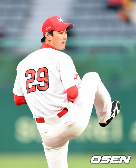타선이 6회 최정의 솔로포로 동점을 만들었고 김광현은 7회에도 마운드에 올라 세 타자를 깔끔하게 처리하고 힘을 냈다. 3-2로 앞선 8회에는 지석훈에게 몸에 맞는 공을 허용했으나 김태군의 희생번트 상황에서 자신이 직접 잡아 2루로 송구 끝에 병살타를 만들어내며 절대 위기에서 벗어났다. /skullboy@osen.co.kr