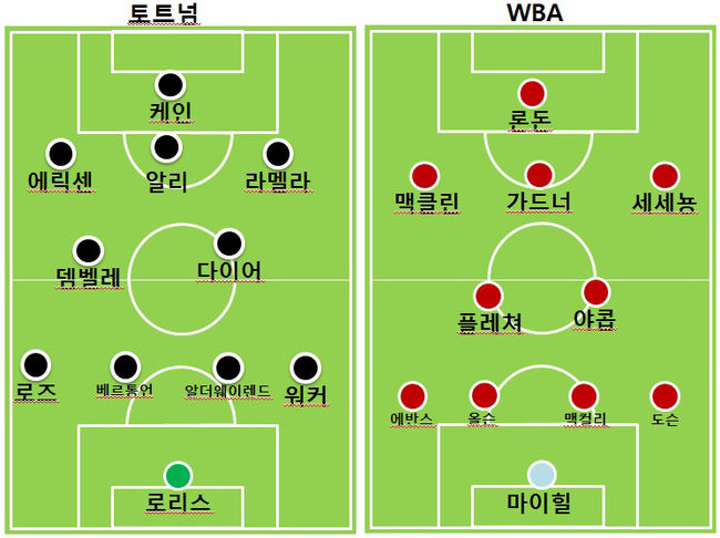 득점선두 해리 케인(24골)이 최전방에 서고 에릭센, 알리, 라멜로가 2선에서 지원했다. 뎀벨레와 다이어가 중원을 맡고 로즈, 베르통언, 알더웨이렐드, 워커가 포백을 봤다. 골키퍼는 로리스가 나섰다. 손흥민은 벤치서 대기했다.