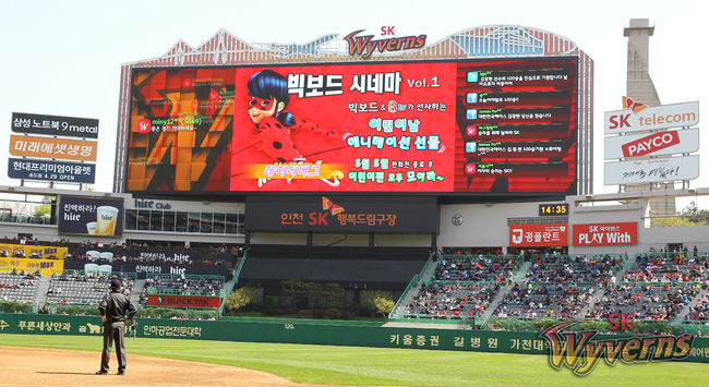 SK 와이번스가 SK브로드밴드와 함께 다음달 5일 어린이날을 맞아 한화 이글스와의 홈 경기 종료 후 ‘B tv와 함께 하는 빅보드 시네마’ 이벤트를 실시한다. 이번 어린이날에 상영하는 영화는 EBS1의 인기 애니메이션인 ‘미라큘러스 레이디버그’이다.