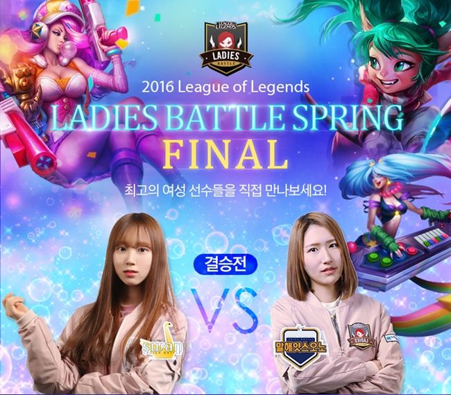 ‘2016 LoL 레이디스 배틀 스프링’ 결승전이 오는 30일 서울 대치동 아프리카 프릭업 스튜디오에서 펼쳐진다. 국내 공식 여성 아마추어 LoL 대회인 ‘2016 LoL 레이디스 배틀 스프링’은 라이엇 게임즈가 주최하고 한국e스포츠협회가 주관하며 아프리카TV 주관 방송한다.
