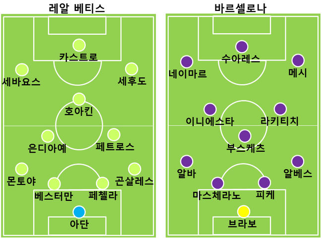 바르셀로나와 레알 베티스 모두 전반전에 이렇다 할 모습을 보이지 못했다. 레알 베티스는 전반 5분 코너킥 기회서 브루노 곤살레스가 위협적인 헤딩슛을 선보인 것이 전부였다. 바르셀로나도 전반 28분 네이마르가 시도한 슈팅 외에는 인상을 남기지 못했다.