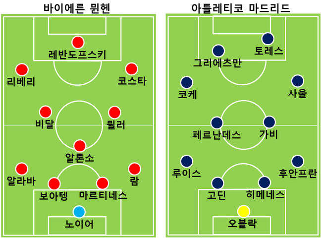전반 20분이 대표적이다. 제롬 보아텡의 긴 패스가 문전으로 쉽게 연결됐고, 토마스 뮐러가 내준 것을 로베르트 레반도프스키가 슈팅으로 연결했다. 아틀레티코 마드리드는 골키퍼 얀 오블락의 선방에 안도의 한숨을 내쉬었다.