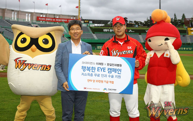 ‘행복한 EYE’ 캠페인은 SK와 한길안과병원이 지난해부터 함께 진행하고 있는 사회공헌 프로그램으로, KBO리그 정규시즌 동안 이재원이 친 안타와 홈런 개수마다 안타는 13만원(병원 10만원, 이재원 3만원), 홈런은 15만원(병원 10만원, 이재원 5만원)씩 기금을 적립하여, 시즌 종료 후 지역 저소득층 주민을 대상으로 안과 진료 및 수술비로 후원할 예정이다.
