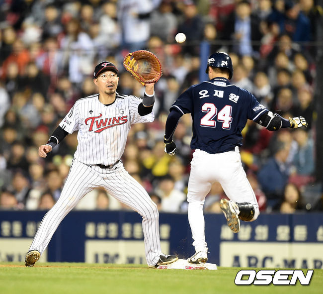 이어진 1사 1루 정성훈은 바뀐 투수 노경은을 상대로 안타를 때려 1사 1·2루에서 두산의 뼈아픈 실책이 나왔습니다. 이병규(9번)가 때린 땅볼을 두산 1루수 최준석이 빠뜨리면서 3루주자 이진영이 홈을 밟았고 오지환이 1사 1·2루에서 우월 2루타를 터뜨려 2루주자 정성훈을 홈으로 불러들였습니다.