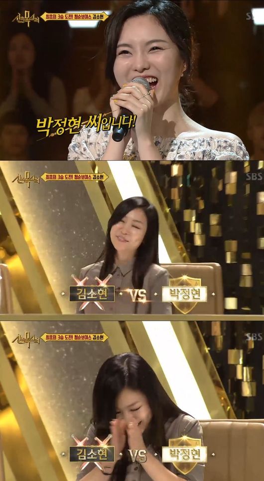 4일 방송된 SBS '신의 목소리'에서는 3승에 도전하는 김소현이 출연했다. 김소현은 박정현을 지목했고, 무패 행진 중인 두 사람의 대결에 기대가 모아졌다.