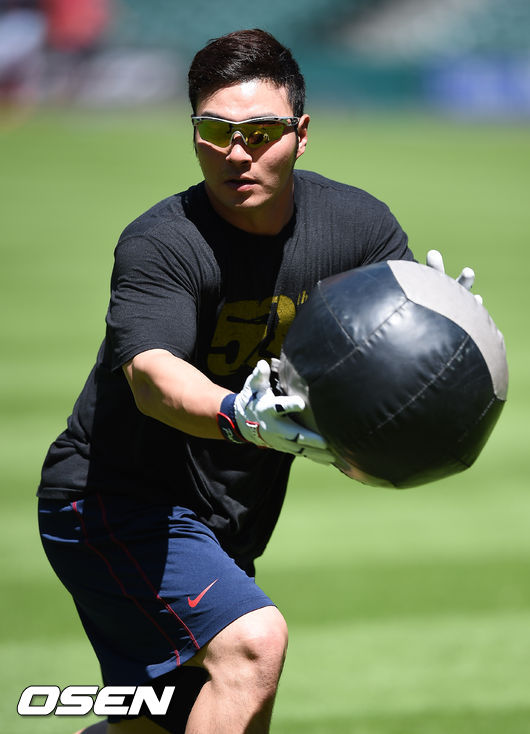 5일(한국시간) 미국 텍사스주 휴스턴의 미닛 메이드 파크에서 열린 2016 메이저리그 휴스턴 애스트로스와 미네소타 트윈스의 경기에 앞서 박병호가 큰공을 들고 근력 훈련을 하고 있다.