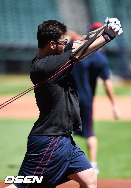 5일(한국시간) 미국 텍사스주 휴스턴의 미닛 메이드 파크에서 열린 2016 메이저리그 휴스턴 애스트로스와 미네소타 트윈스의 경기에 앞서 박병호가 큰공을 들고 근력 훈련을 하고 있다.