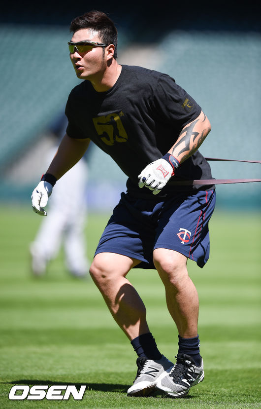 5일(한국시간) 미국 텍사스주 휴스턴의 미닛 메이드 파크에서 열린 2016 메이저리그 휴스턴 애스트로스와 미네소타 트윈스의 경기에 앞서 박병호가 근력 훈련을 하고 있다.