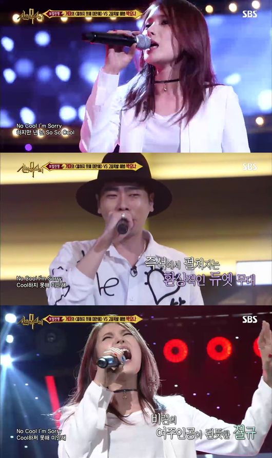 거미는 지난 4일 방송된 ‘신의 목소리’에서 UV(뮤지, 유세윤)의 ‘쿨하지 못해 미안해’를 애절하게 소화했다. 원곡은 다소 웃긴 요소가 있지만 거미의 처연한 목소리가 더해져 풍부한 감성의 발라드곡으로 재탄생했다. ‘신의 목소리’는 아마추어 실력자와 프로 가수가 대결을 벌이는 음악 경연 예능. 프로 가수는 아마추어 실력자가 즉석에서 꼽아주는 노래를 긴 연습 없이 불러야 하는 어려움이 있다. 거미는 즉석에서 이 곡을 부여받은 후 자신만의 애절한 감성을 더해 색다른 곡으로 완성했다. 특히 원곡자인 뮤지가 중간에 합동 무대를 꾸며 감성이 더욱 풍성하게 다가왔다.