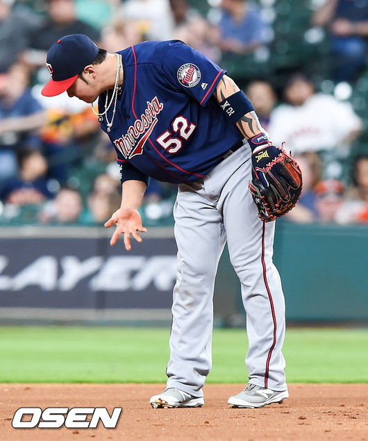 5일(한국시간) 미국 텍사스주 휴스턴의 미닛 메이드 파크에서 열린 2016 메이저리그 휴스턴 애스트로스와 미네소타 트윈스의 경기,3회말 2사 휴스턴 발부에나의 강습타구를 놓친 박병호가 자리에서 일어나고 있다.