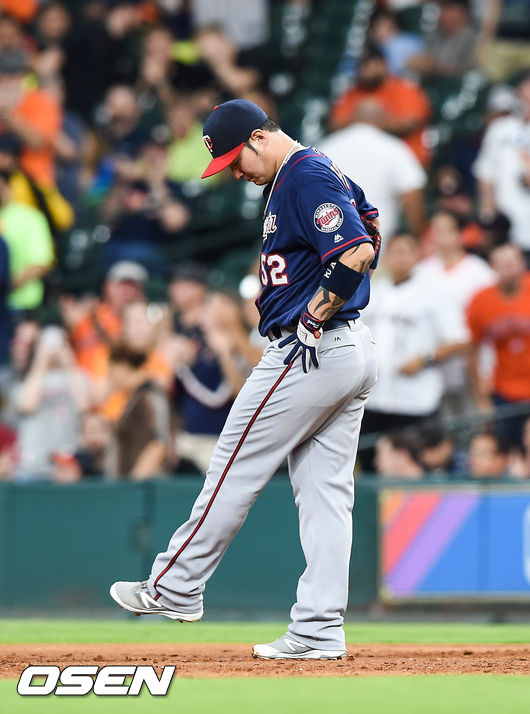 5일(한국시간) 미국 텍사스주 휴스턴의 미닛 메이드 파크에서 열린 2016 메이저리그 휴스턴 애스트로스와 미네소타 트윈스의 경기,3회말 2사 1루 휴스턴 카스트로의 2점 홈런때 박병호가 아쉬워하고 있다. 박병호는 전 타석 발부에나의 타구를 잡았다 놓치며 발부에나를 1루에 진루시켰다.