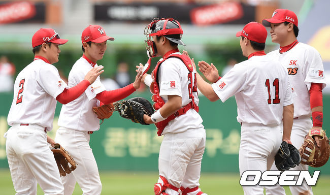 승리를 거둔 SK 선수들이 하이파이브를 하고 있다. / youngrae@osen.co.kr