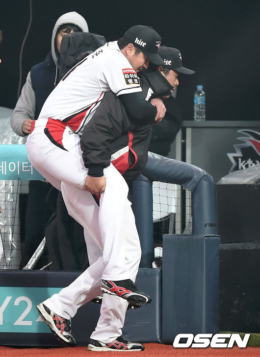 유한준은 1회초 1사 1루서 정근우의 우익수 방면 뜬 타구를 먼 거리부터 달려와 잡았다. 하지만 공을 잡은 직후 왼쪽 다리에 통증을 호소하며 그라운드에 쓰러졌다. 유한준은 한동안 일어나지 못했고 결국 구단 직원의 등에 업혀 그라운드를 나갔다. kt 관계자는 "왼쪽 사타구니 부위에 통증을 느껴 교체됐다. 지금은 아이싱 중이며 추후 검진을 받을 예정이다"라고 전했다. /krsumin@osen.co.kr