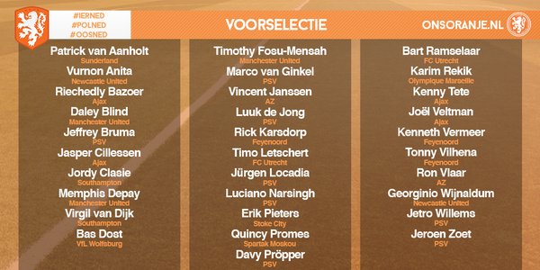 유로 2016 본선행이 좌절된 대니 블린트 네덜란드 감독은 웨슬리 스네이더와 로빈 반 페르시를 비롯해 아르옌 로벤과 클라스-얀 훈텔라르 등 베테랑을 대거 제외하며 세대교체에 박차를 가했다.