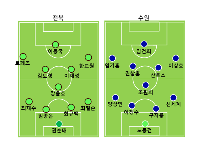 이에 맞서는 수원은 수문장 노동건을 비롯해 신세계 구자룡 이정수 양상민이 뒷마당을 지켰다. 조원희가 올 시즌 처음으로 수비형 미드필더로 나섰고, 염권산(염기훈 권창훈 산토스)과 이상호가 미드필드진을 구축했다. 최전방은 김건희가 맡았다.