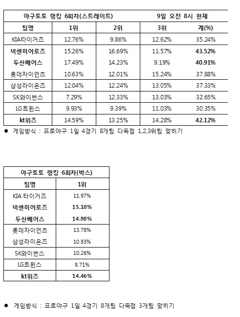 체육진흥투표권 스포츠토토의 수탁사업자인 ㈜케이토토(www.ktoto.co.kr)는 5월 10일(화)에 열리는 LG-삼성, SK-두산, KIA-kt, 롯데-넥센전 등 4경기 8개팀을 대상으로 한 야구토토 랭킹 6회차 스트레이트 게임 중간집계 결과, 넥센(43.52%), kt(42.12%), 두산(40.91%)이 다득점 상위 3개팀으로 꼽혔다고 밝혔다. 반면 LG와 SK는 각각 30.35%와 32.65%를 득표해 가장 적은 득점을 기록할 것으로 예상했다. 또, ‘박스’ 게임에서도 넥센(15.10%)이 1순위를 차지한 가운데, 두산(14.90%)과 kt(14.46%)가 뒤를 이었다.