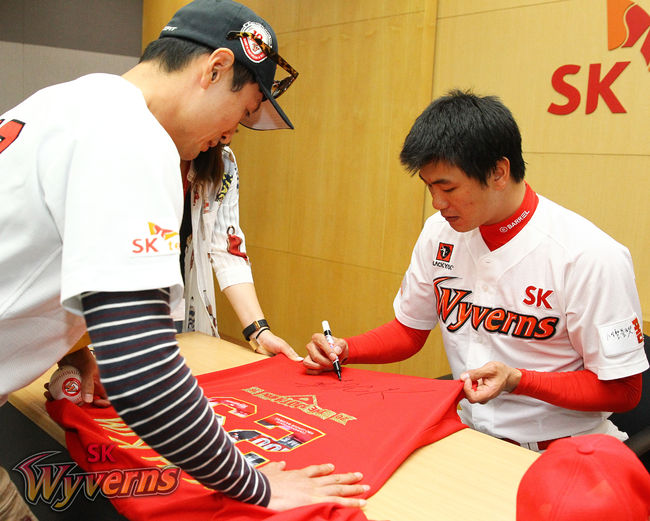 지난 4일 인천SK행복드림구장의 대회의실에는 경기 시작 2시간 전 특별한 손님들이 찾아왔다. 바로 김광현이 마련한 ‘글러브 이벤트’에 참여한 팬들이었다. 김광현은 지난 4월 24일 인천 NC전에서 개인 통산 100승을 달성했다. 평소 사회 환원에 대한 생각이 강했던 김광현은 ‘100승’이라는 상징적 숫자를 맞이해 자신의 생각을 실천했다. 글러브 이벤트도 그 중 하나였다.