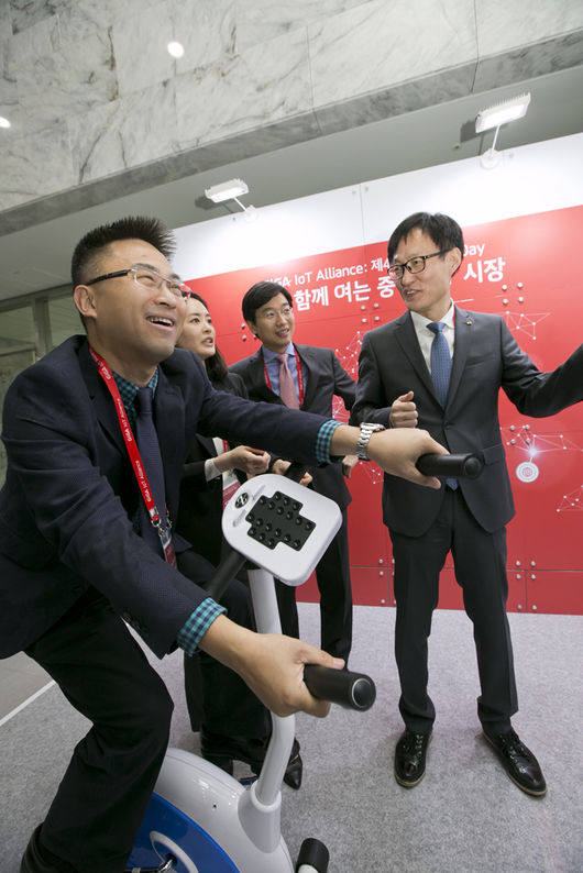[사진] 차이나모바일(CMIOT) 솔루션센터 왕타오(Wang Tao) 총경리(왼쪽)가 김준근 KT 기가 IoT 사업단장으로부터 설명을 들으며 기가 IoT 헬스바이크를 체험하는 모습 /KT 제공