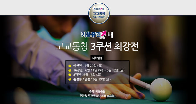 SBS스포츠가 키움증권과 함께 국내 최초 팀플레이 방식으로 대결을 펼치는 '키움증권배 고교동창 3쿠션 최강전'을 개최한다.