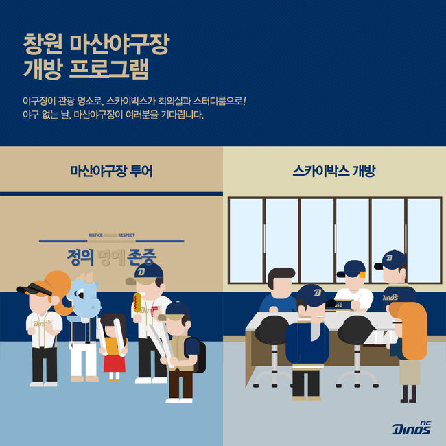 야구장 투어와 스카이박스 사용은 2016 시즌티켓이나 멤버십 회원이라면 누구나 신청 가능하다. 다만 스카이박스 사용 시 1인당 1,000원의 비용이 발생한다. 참가를 원하는 팬은 구단 이메일(event@ncdinos.com)로 원하는 날과 신청자 정보를 적어 보내면 된다. 참가 확인은 개별 연락하여 안내한다.