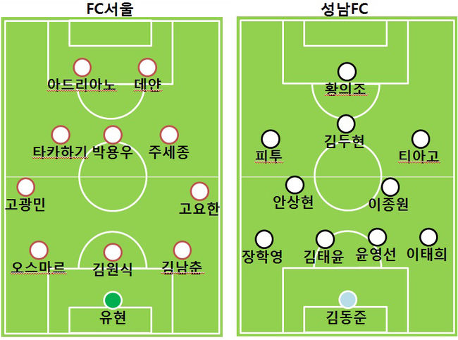 서울은 아드리아노, 데얀 투톱을 앞세웠다. 타카하기, 박용우, 주세종이 중원을 맡고 고광민과 고요한이 양측면에 섰다. 오스마르, 김원식, 김남춘의 수비에 유현이 골키퍼 나섰다.