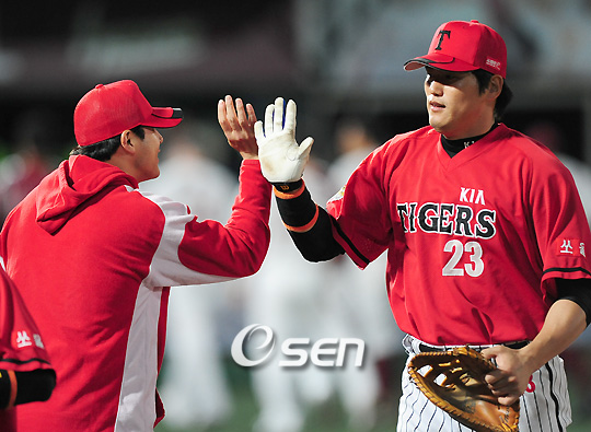 [사진] 2009년 한국시리즈 우승 후 서재응과 최희섭.