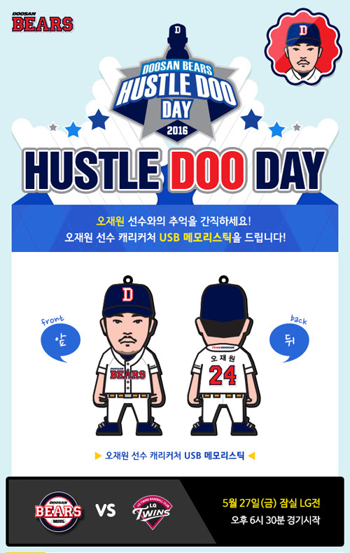 ‘허슬두데이’는 두산을 대표하는 스타 선수를 활용해 팬들과의 커뮤니케이션 활동을 활성화하고, 이를 통해 팬들의 사랑에 보답하고자 기획된 스타 마케팅 전략이다. 아울러 올해 ‘허슬두데이’는 ‘HUSTLE DOO MEMORY’라는 컨셉으로 스타 선수와의 추억을 담을 수 있는 USB 메모리 스틱을 증정하는 것으로 기획됐다.