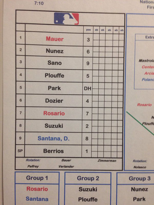[사진] 브라이언 머피 기자가 트위터에 올린 미네소타의 변경 전 선발 라인업.