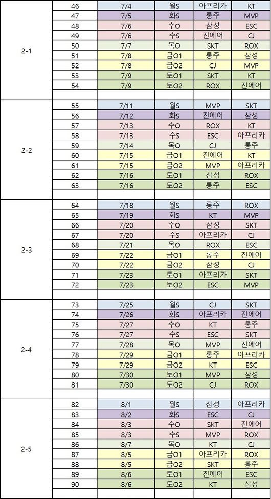 처음으로 분할 중계를 시도하는 이번 롤챔스 서머는 스포티비 게임즈가 월, 화, 수 등 주 3일 3경기, OGN이 수, 목, 금, 토 등 4일 간 6경기를 담당한다. 일정에 따라 다소 차이가 있을 수 있으나 월, 화, 목요일에는 1경기, 수, 금, 토요일에는 2경기씩 분포됐다.