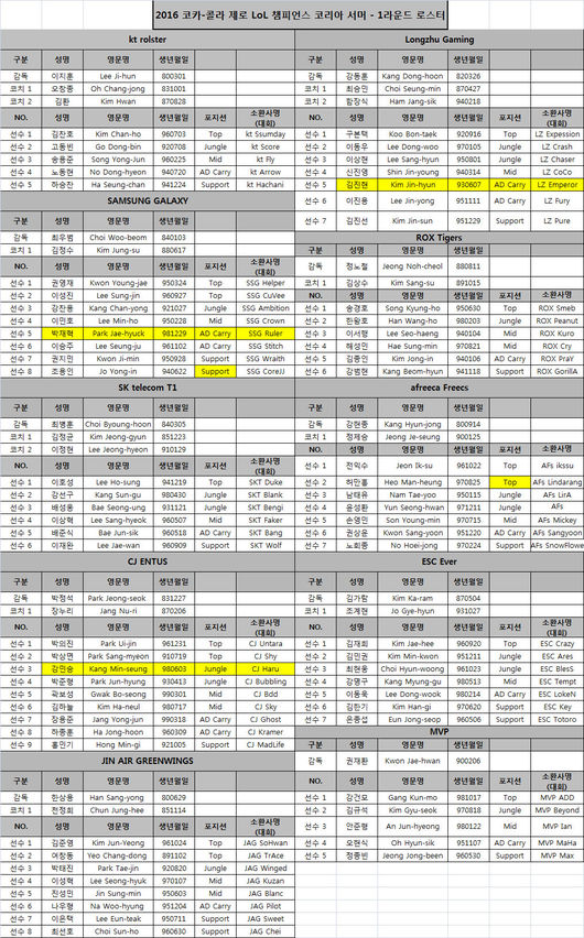 한국e스포츠협회는 20일 오후 오는 25일부터 시작하는 ‘2016 코카-콜라 제로 LoL 챔피언스 코리아 서머’ 개막에 앞서 1라운드 로스터를 발표했다. 이번 1라운드 로스터는 한국e스포츠협회 LoL 페이스북과 트위터를 통해 공개됐다.