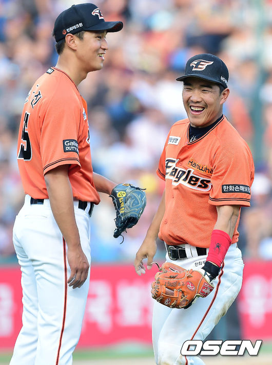 21일 오후 대전 한화생명 이글스 파크에서 열린 '2016 타이어뱅크 KBO 리그' 한화 이글스와 kt 위즈의 경기 5회초 무사 1루 정근우가 하준호의 땅볼타구를 잡아 2루로 뛰던 1루주자 김종민을 태그아웃 시키고 1루로 송구해 하준호까지 병살을 만들고 미소를 짓고 있다. 하지만 kt의 합의판정 요청으로 하준호는 1루에서 세이프로 번복. / baik@osen.co.kr