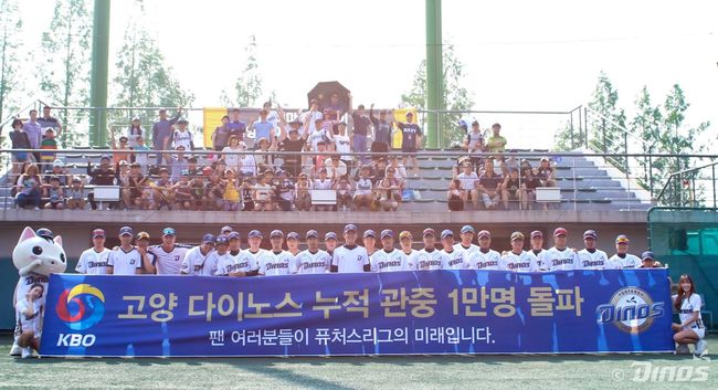 [사진] 고양 다이노스 선수단이 1만 관중 돌파 기념으로 팬들과 기념 촬영을 했다. /NC 제공