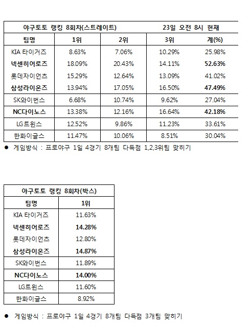 체육진흥투표권 스포츠토토의 수탁사업자인 ㈜케이토토(www.ktoto.co.kr)는 5월 24일(화)에 열리는 넥센-한화, 삼성-KIA, NC-SK, 롯데-LG 등 4경기 8개팀을 대상으로한 야구토토 랭킹 8회차 스트레이트 게임 중간집계 결과, 넥센(52.63%), 삼성 (47.49%), NC(42.18%)가 다득점 상위 3개팀으로 꼽혔다고 밝혔다. 반면 KIA와 SK는 각각 25.98%와 27.04%를 득표해 가장 적은 득점을 기록할 것으로 예상했다. 또, ‘박스’ 게임에서는 삼성(14.87%)이 1순위를 차지한 가운데, 넥센(14.28%)과 NC(14.00%)가 뒤를 이었다.