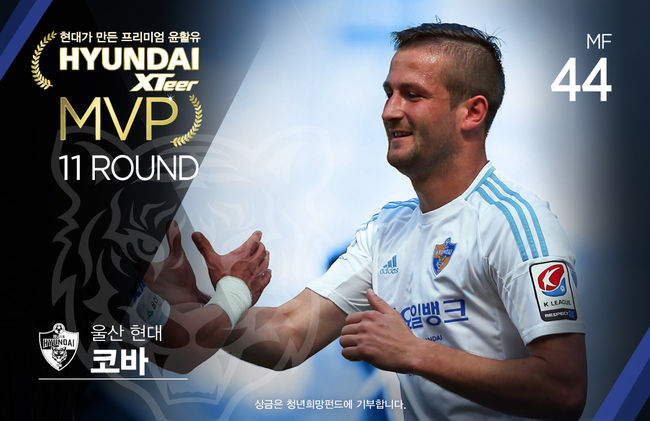 코바(울산현대,28)가 K리그 클래식 11라운드 '현대엑스티어 MVP'에 선정됐다.