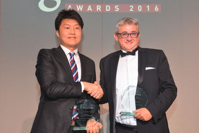 [사진] LG유플러스 최홍준 글로벌 로밍 팀장(왼쪽)과 공동 수상한 글로벌 IPX 업체 시니버스의 데릭 고흐마케팅 부사장이 GTB 이노베이션 어워드에서 모바일 인프라 혁신상을 수상한 모습. /LG유플러스 제공