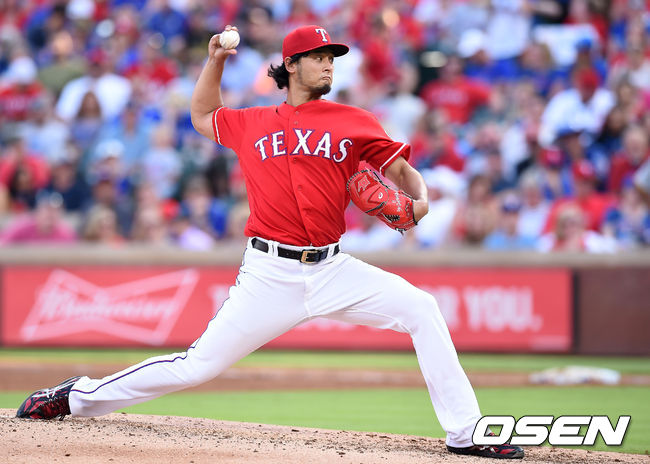 29일(한국시간) 미국 텍사스주 알링턴 글로브라이프 파크에서 열린 '2016 메이저리그' 텍사스 레인저스와 피츠버그 파이어리츠의 경기, 3회초 텍사스 다르빗슈가 역투하고 있다.